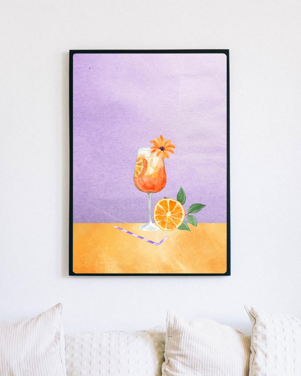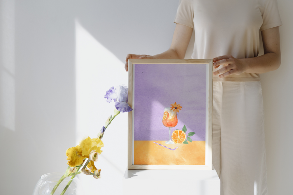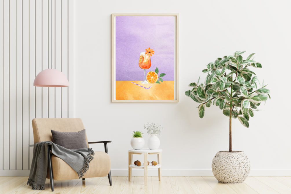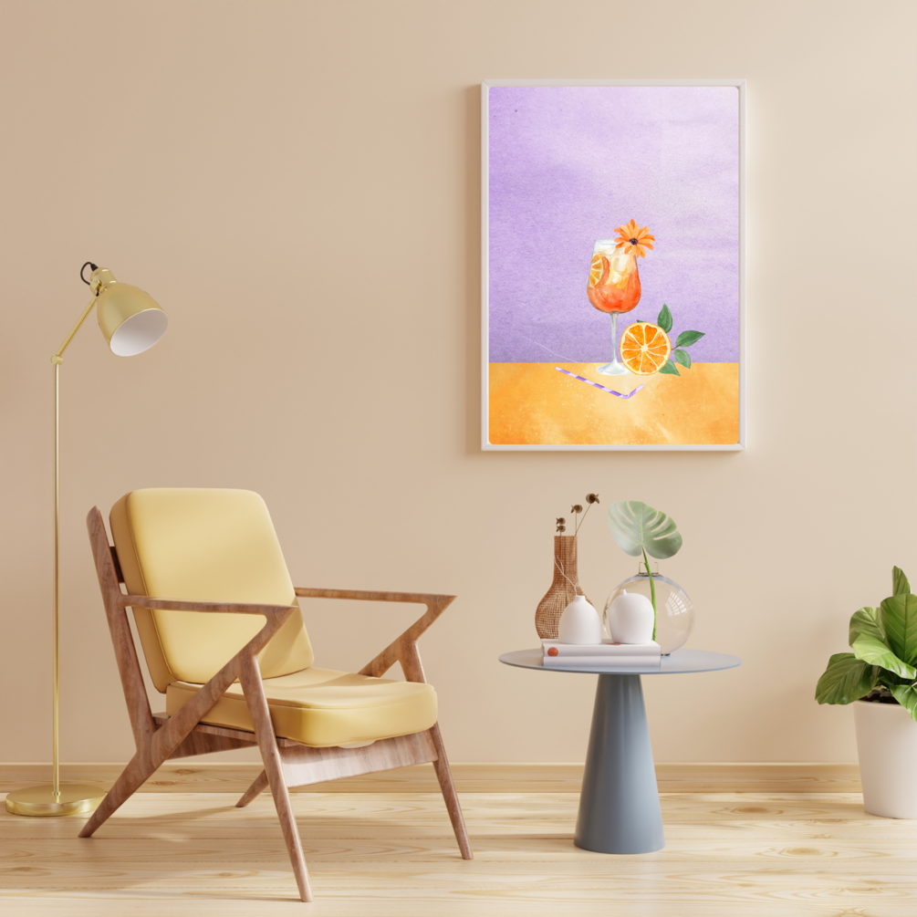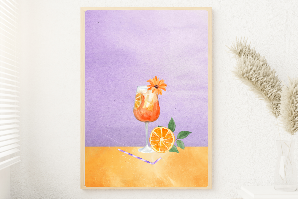 Experience the refreshing and vibrant world of Aperol Spritz through a stunning digital artwork featuring a watercolor illustration of the drink. Set against a captivating purple background, this artwork is a perfect decoration for your home or office.