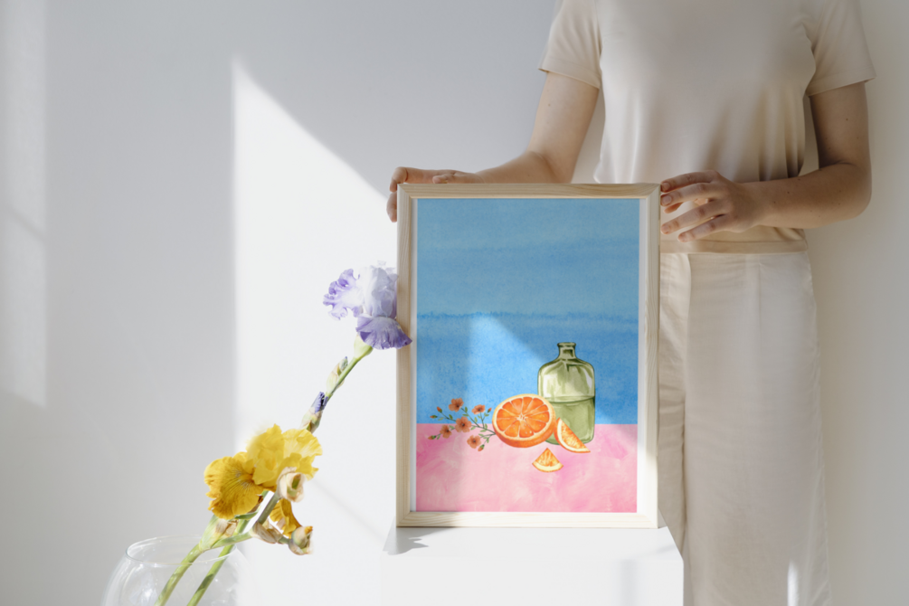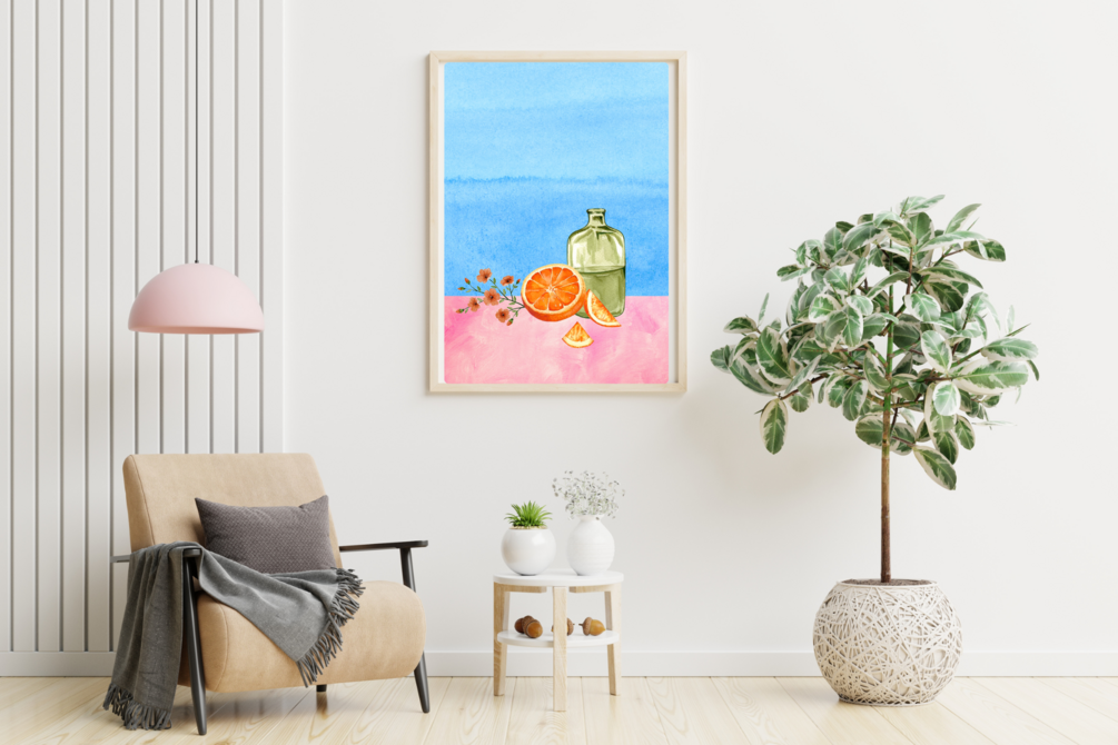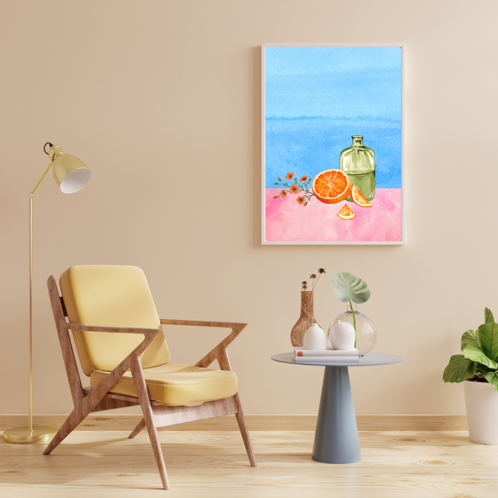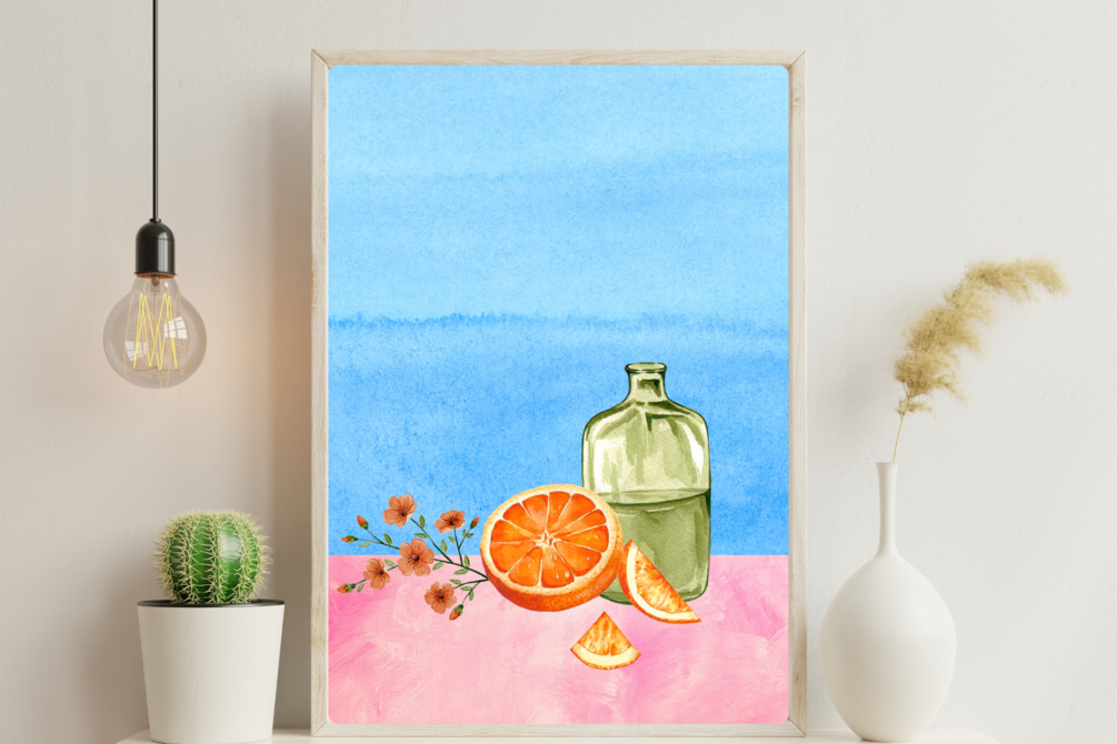 Looking for a unique and vibrant gift idea? Check out this stunning digital artwork featuring an orange watercolor still-life, a green water bottle, and a vibrant blue and pink background. Perfect for kitchen decor or as a housewarming gift.