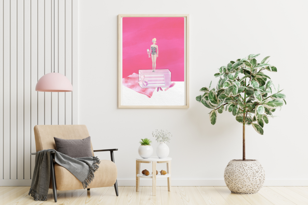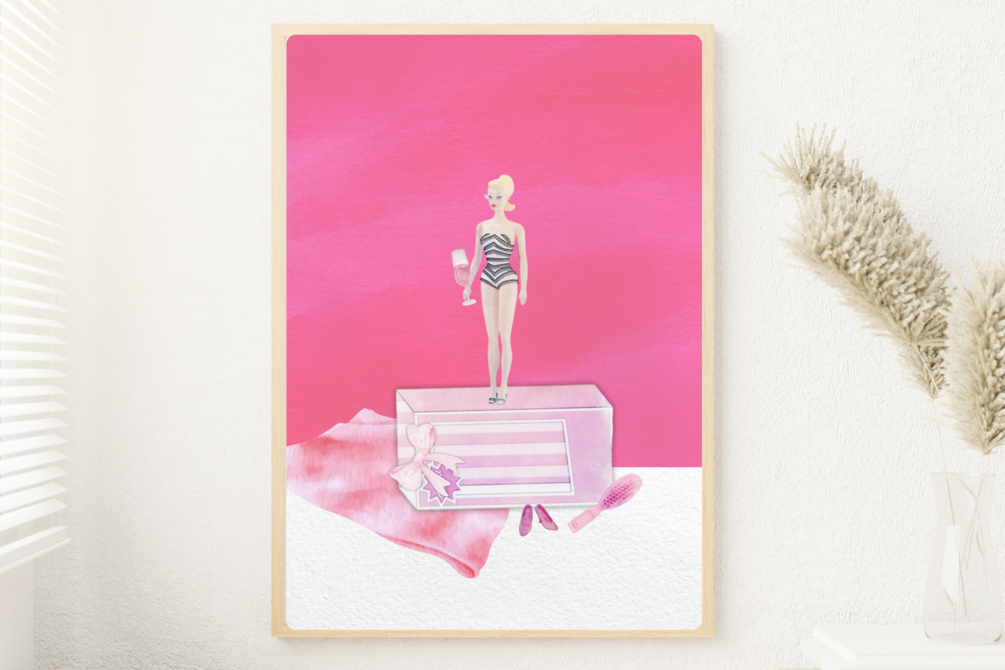 Pink Doll Poster Retro Watercolor Girl's Room Wall Decor Pink Doll Art Interior Toy Motif Girly Decoration Pink Poster Unique Kid's Room
